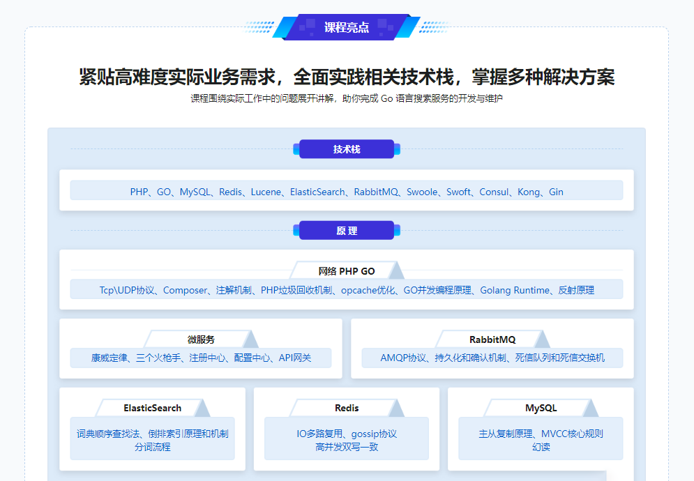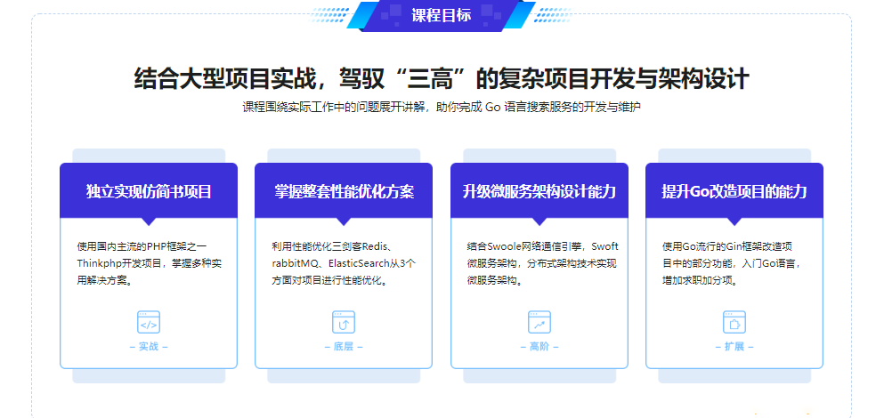 PHP程序员唯有掌握更高级的技能和架构设计思维,才能发展的更好。让自己成为不可替代的人员,需要全面提升掌控大中型项目能力、架构设计思维能力、独立完成复杂项目能力。本课程通过复杂大型项目实战,系统讲解各技术实现的底层原理和算法,带你掌握性能调优以及高可用、高并发微服务架构,并上手Go语言框架,进一步提升自己的技术储备,为你求职和涨薪增加筹码!
