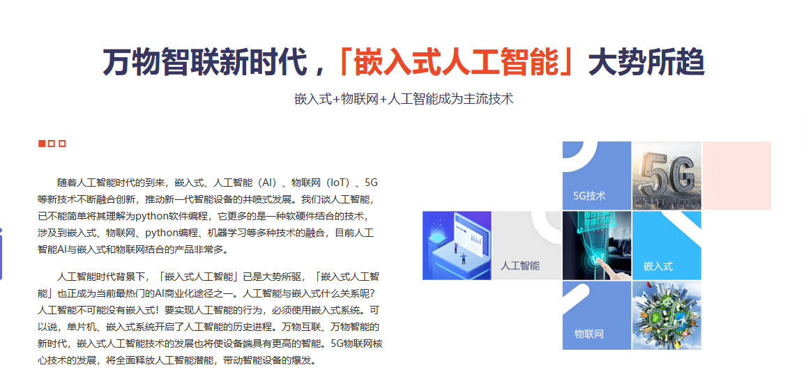 随着人工智能时代的到来,嵌入式、人工智能(AI)、物联网(IoT)、5G等新技术不断融合创新,推动新一代智能设备的井喷式发展。我们谈人工智能,已不能简单将其理解为python软件编程,它更多的是一种软硬件结合的技术,涉及到嵌入式、物联网、python编程、机器学习等多种技术的融合,目前人工智能AI与嵌入式和物联网结合的产品非常多。