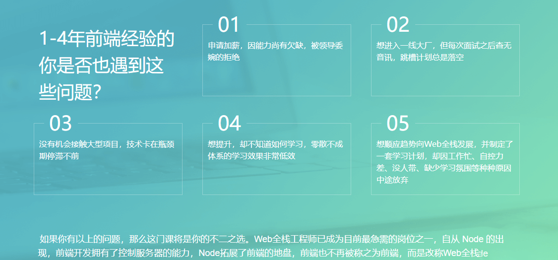 主要针对1—4年工作经验的前端开发人员,大纲由IT界知名大牛——廖老师亲自打造, 由一线大型互联网公司全栈架构师/技术总监授课, 内容涵盖深入Vue/React/Node/实战小程序/微信公众号开发/React-native/工程化/自动化测试等