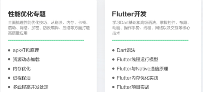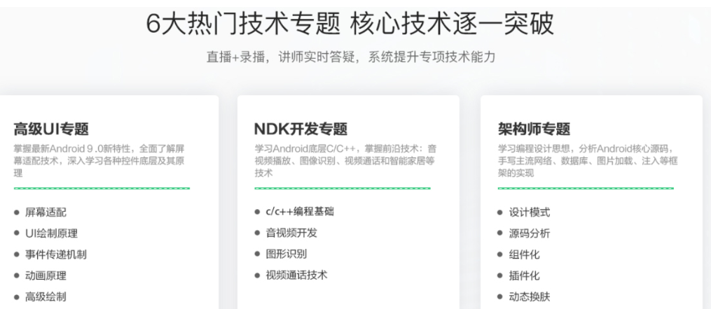 某易一线工程师全程讲解,带你突破Android技术瓶颈,课程包含了6大专题,分别是高级UI、NDK开发、架构师、性能优化、Flutter和某易商业化项目分享。从技术理论到案例展示,层层递进。四大某易真实项目,助力年薪百万!!!