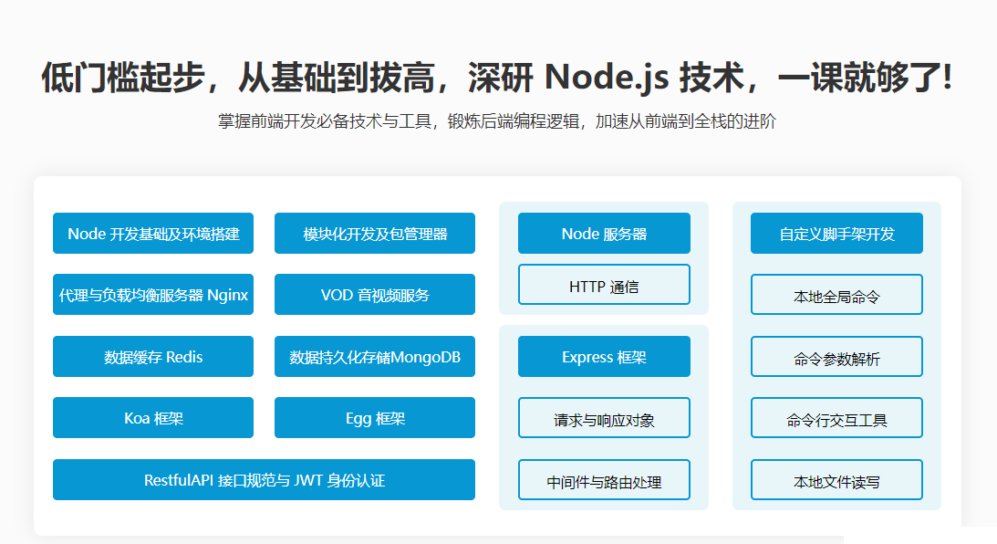 作为前端工程师必备技能,Node.js 近几年热度空前。我调研了很多前端学员在学习 Node.js 时遇到的问题,有针对性的设计了这门适合初中级前端的 Node.js 课程。课程贯穿开发工具、后端接口应用、主流Node框架应用等内容,技术点与实战项目结合学习,让学员由浅入深,全面掌握 Node.js 开发技术栈