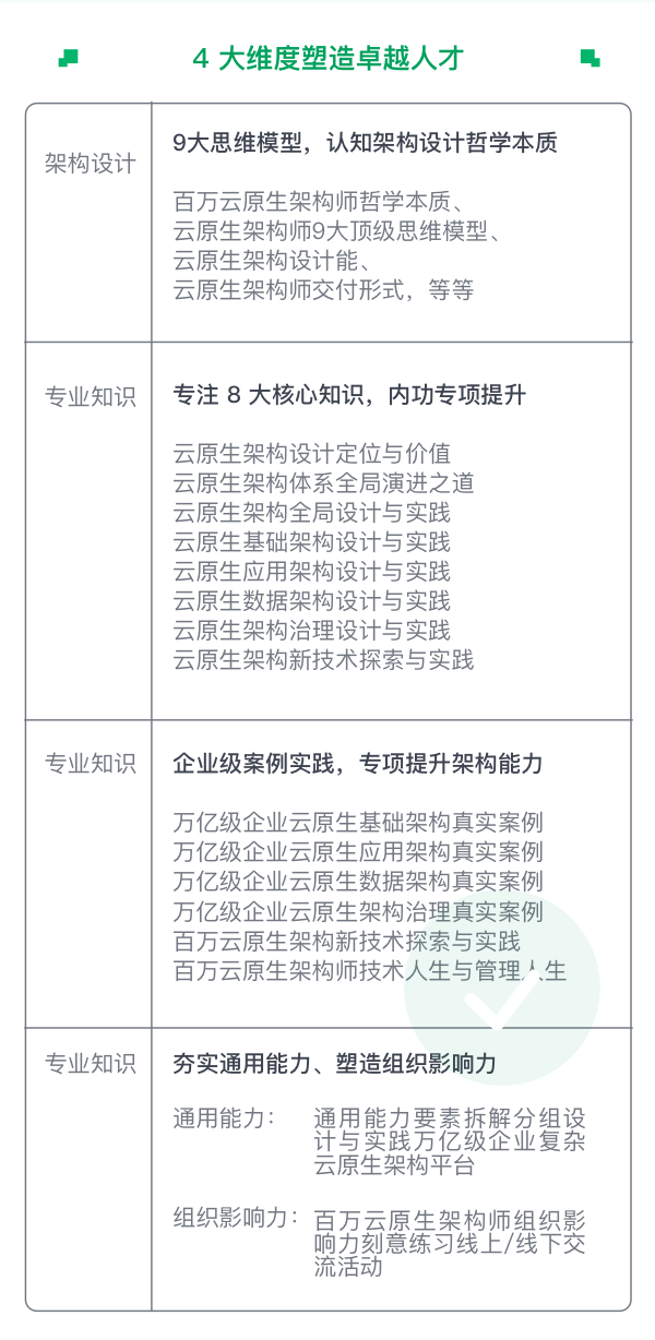 行业首次深度揭秘,真实还原超一线大厂云原生真实场景;架构哲学思想与实践相结合,全方位打造万亿级云原生架构师;100+技术点,1000+技术分支带你彻底掌握万亿级云原生架构;具备云原生架构师以不变应万变的架构设计哲学本质能力
