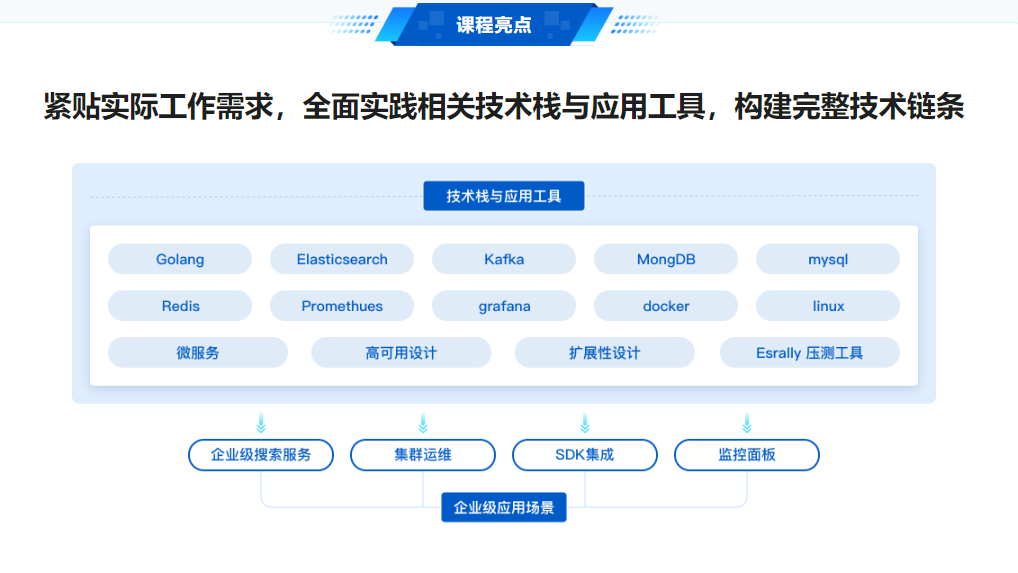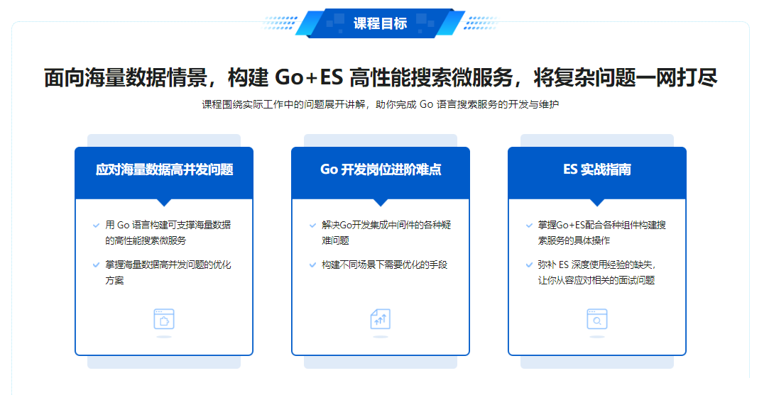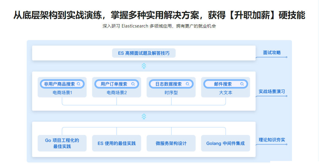 有应用的地方就会有搜索,有搜索的地方就能使用 Elasticsearch 来实现,Elasticsearch 用起来简单,但想要做好还是有很高的技术门槛的。要用 Go 语言构建搜索服务,并完成海量数据的优化方案,缺乏经验就会有诸多问题暴露,难免走弯路。本课程通过对基础技能到实战项目的深度解读,带你夯实 ES+Go 的底层技能,积累实战经验,一举跃升经验丰富的 Go 语言开发者。