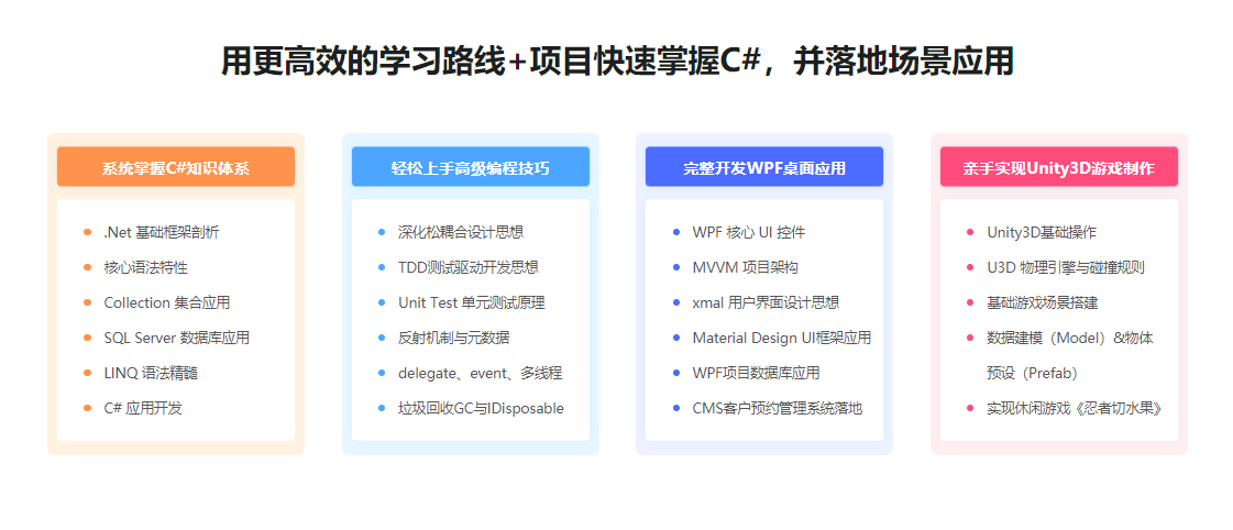 作为唯一一种在Windows下能给出全套解决方案的编程语言,C#在Web应用、移动开发、游戏、云服务领域都有不俗的表现,更是外资、医药、金融行业的宠儿。本课程全方位讲解了C#语言的核心知识和高阶编程技巧,并结合WPF客户管理系统和Unity3D切水果游戏两大实战项目,帮你实现技术的精通,完成从Zero到Hero的蜕变!