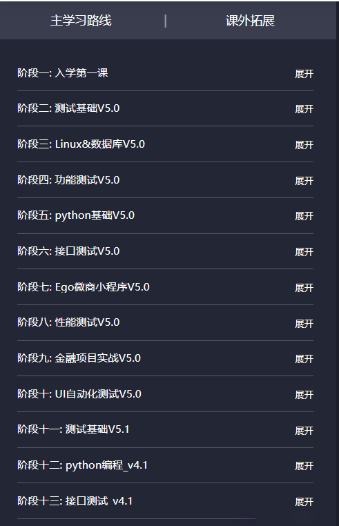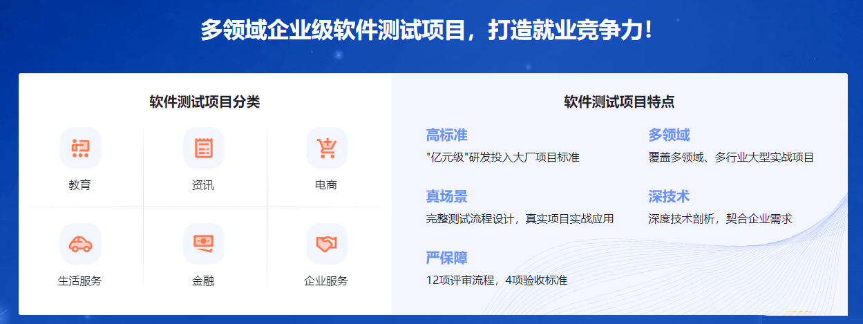 课程知识体系完备,从计算机基础,到功能测试,再到自动化测试,课程涵盖测试工具使用、测试原理讲解、自动化测试框架的实现等,同时覆盖多业务领域,如:电商、金融、小程序等