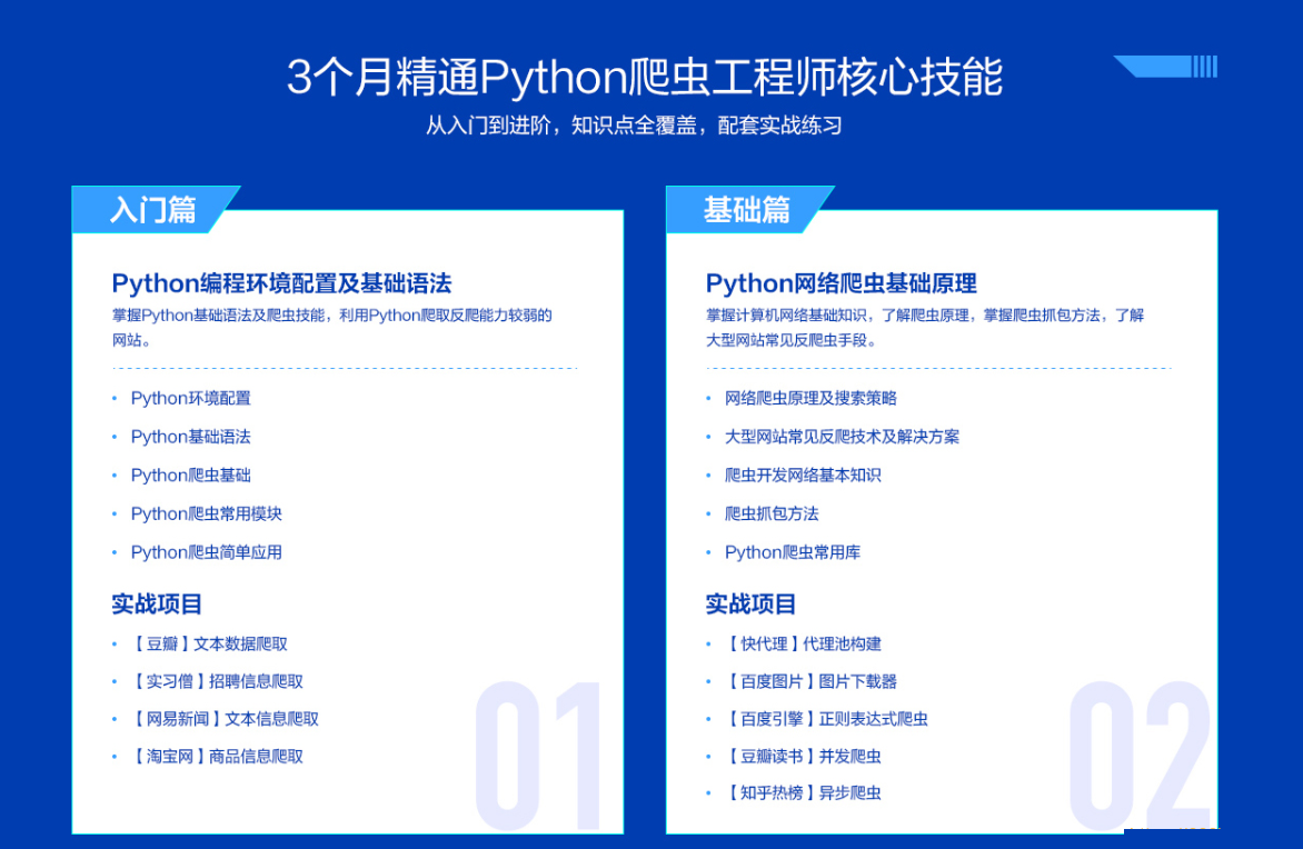 课程采用“Python基础—爬虫原理—数据存储—并发编程—反爬攻防—分布式架构”的六维进阶体系,带你彻底打通从Python环境配置、面向对象编程、Requests网络请求到Scrapy框架应用的完整技术闭环。你将不再局限于简单的静态网页抓取,而是深入掌握Selenium动态渲染、多线程/多进程并发、异步IO编程及Celery分布式任务调度等高级技术。课程重点结合电商、社交、音乐等真实商业场景,涵盖Fiddler抓包、字体反爬破解、JS逆向登录及代理池构建等核心硬技能,助你构建“懂网络、精逆向、能架构”的高级爬虫工程师思维,从容应对互联网大厂对海量数据采集与处理的高薪挑战。