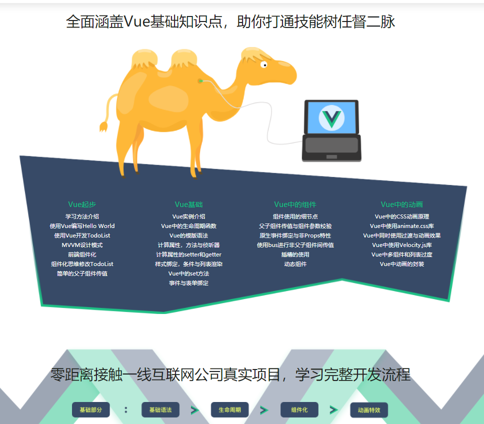 从Vue基础语法入手,逐层递进,实战项目贴近企业流程,完全按照企业级别代码质量和工程开发流程进行授课,让你理解这套技术在企业中被使用的真实流程。更好的掌握Vue各个基础知识点。