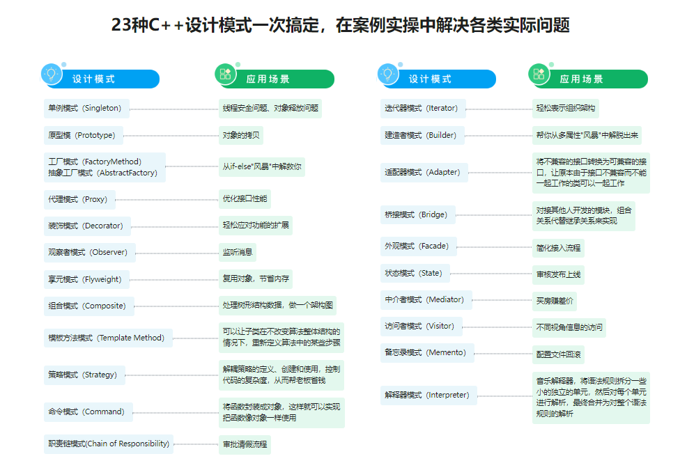 课程摒弃了枯燥的理论堆砌,采用“职场痛点引入—设计模式解构—C++特性落地”的三维进阶体系,带你彻底打通从单例、原型、工厂等创建型模式,到代理、装饰、适配器等结构型模式,再到观察者、策略、命令等行为型模式的完整知识闭环。你将不再局限于写满if-else的“面条代码”,而是深入理解GoF 23种设计模式背后的设计哲学。课程重点结合C++语言特性(如深拷贝/浅拷贝、运算符重载、多线程安全),通过“帮老板省钱”、“审批请假流程”、“配置文件回滚”等生动职场案例,助你构建“懂原理、会应用、能重构”的高级架构思维,从容应对大厂面试与复杂系统开发的高薪挑战。