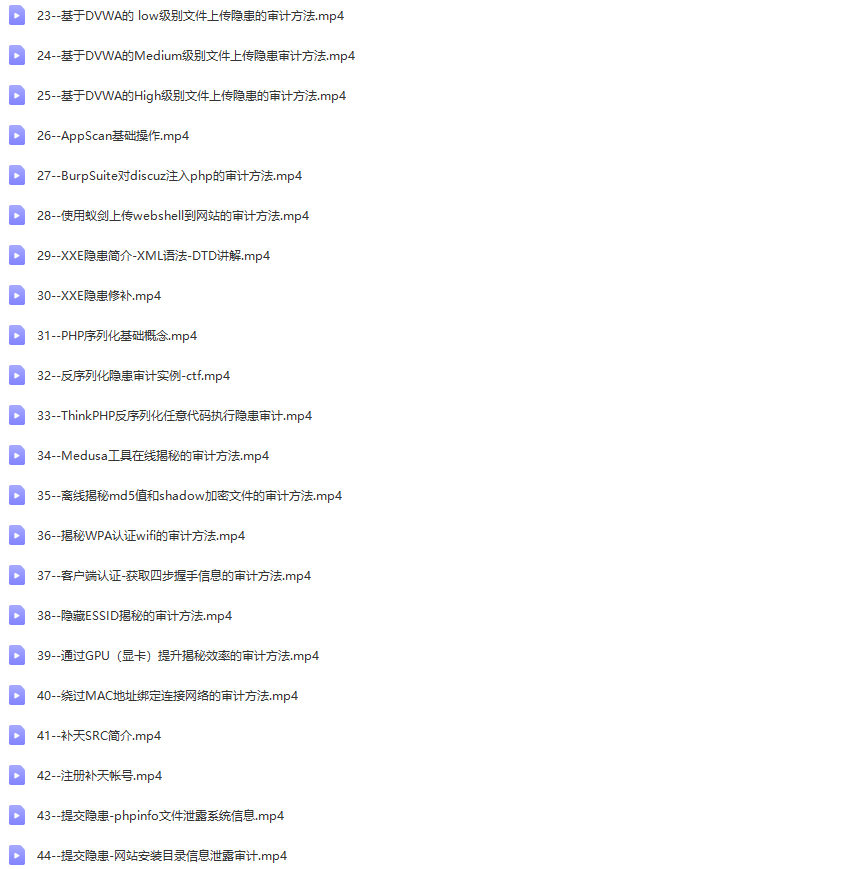 ├──25–基于DVWA的High级别文件上传隐患的审计方法.mp4 132.00M