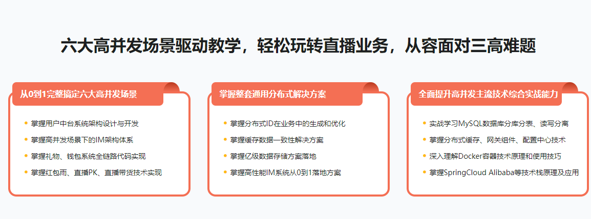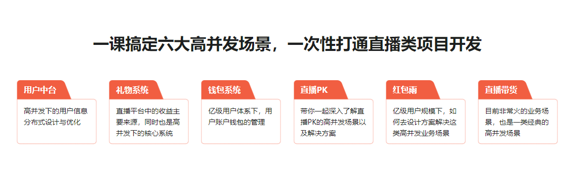 直播领域发展迅速,人才需求量极大,但能完整驾驭高并发场景下直播场景的人才还不多。 本课程通过六个高并发场景-用户中台服务,IM即时通讯,礼物打赏、直播PK、红包雨、直播带货秒杀,带你从0到1,循序渐进实战落地,让你对直播业务场景有更透彻的理解,对直播技术栈有更全面的掌握,对高并发解决方案有更强的设计与实战能力。课程旨在助力你提升在直播领域的职业竞争力。