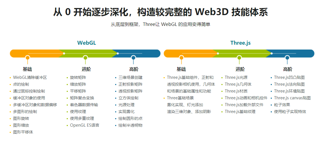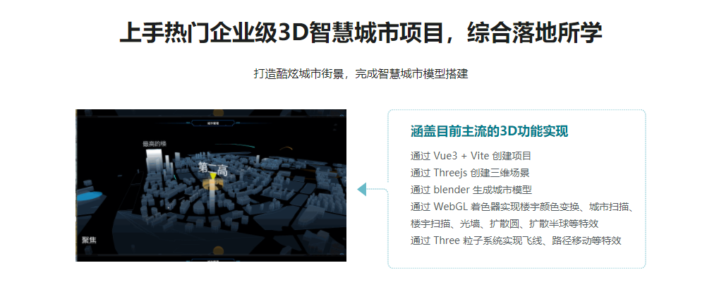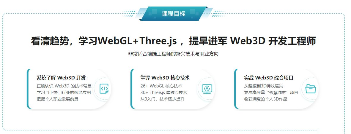 随着元宇宙、数字孪生的火热,前端3D可视化需求越来越广泛,懂 WebGL 技术的前端人才也成为行业香饽饽,薪资诱人颇有竞争力。本课程系统组织了WebGL 和 Three.js 知识内容,并结合图形学相关的数学知识,带你从0基础入门,体系化学习它们的基本、进阶、高级用法。最终通过一款高质量的 3D 可视化项目-智慧城市,让你顺利将 WebGL 和 Three.js 技术落地,掌握其实际应用