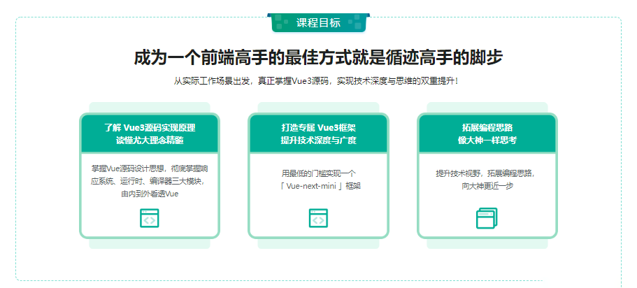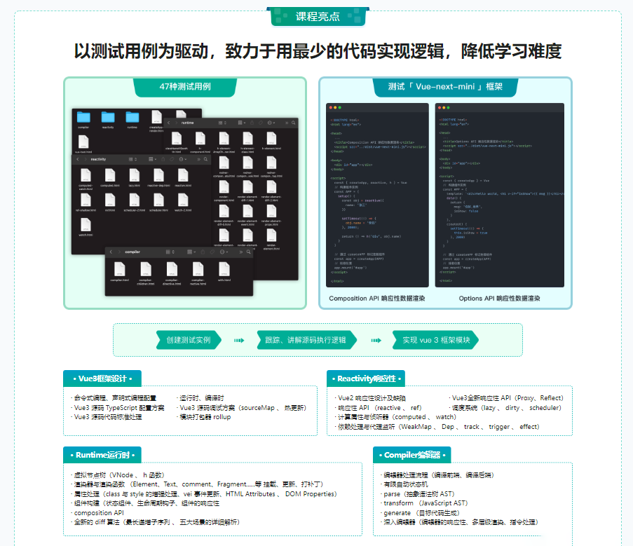 这不是一个高冷、不接地气的源码课!而是一个从开发者实际工作角度出发,结合 Vue 3 的设计机制,通过产出一个精简版 Vue 3 框架的方式,让大家可以站在 Vue 3 源码设计者的角度,俯视所有业务场景,彻底搞清楚每一行 Vue 代码背后,Vue 都做了什么!课程的核心设计原则:让更多的人,以更轻松的方式,学习Vue 3 源码!